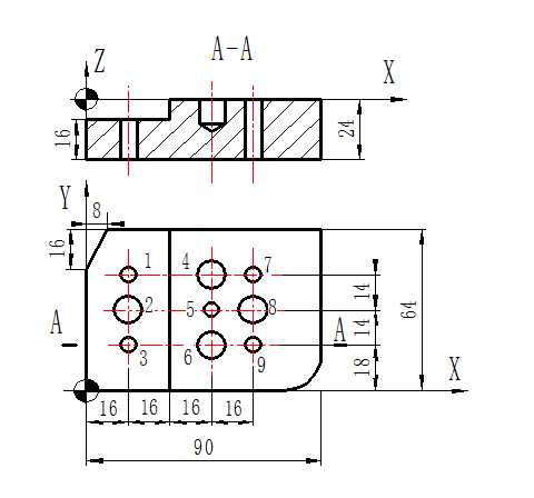 本实例中零件图及毛坯位置图如图3-2所示,其中,#1、#2、#5、#6、#7、#8、孔深10mm,#3、#4、#9为通孔。由于零件较小,外形规则,采用平口钳装夹即可,选择以下四种刀具进行加工:1号刀为φ50mm端铣刀,用于铣上表面; 2号刀为φ20mm立铣刀,用于铣左台阶面; 3号刀为φ6mm钻头, 4号刀为φ11mm钻头,用于加工孔。通过测量刀具,设定补偿值用于刀具补偿。该零件工艺规程见表3-3,工件坐标系的建立,参考点及程序零点的确定如图3-2所示。