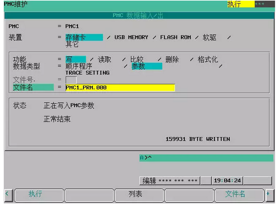 (2)输出到存储卡。按软键【文件名】,生成默认文件名“PMC1_PRM.000”,再按【EXEC】,屏幕提示“正在写入PMC参数”;